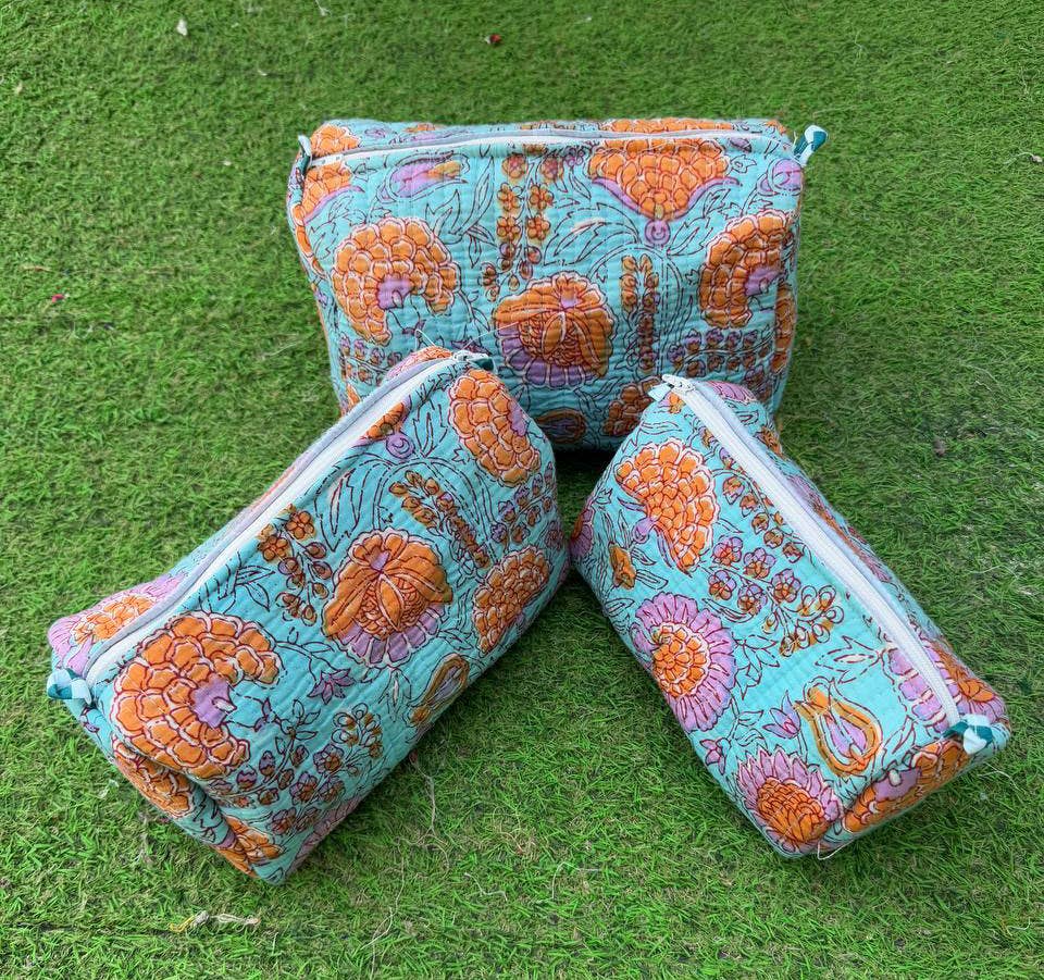 Toiletry Bag Sky Blue Quilted Cotton Block Print Makeup Bags