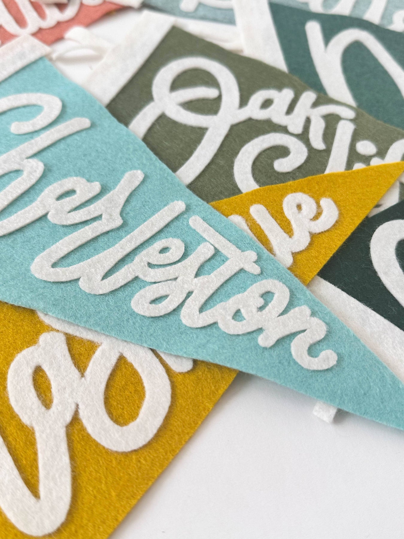 custom hand lettered wool pennant. love our other city + state pennants? We can make one custom for your specific location! ---> Just leave your city and/or state name in the custom box. If you don't see a felt color that you would like to have, just message us! We can definitely get more colors than we have listed. measurements : 10 in. x 6 in. • slight variation may occur from pennant to pennant due to their handmade nature *  colors may vary from how they appear on your screen  *