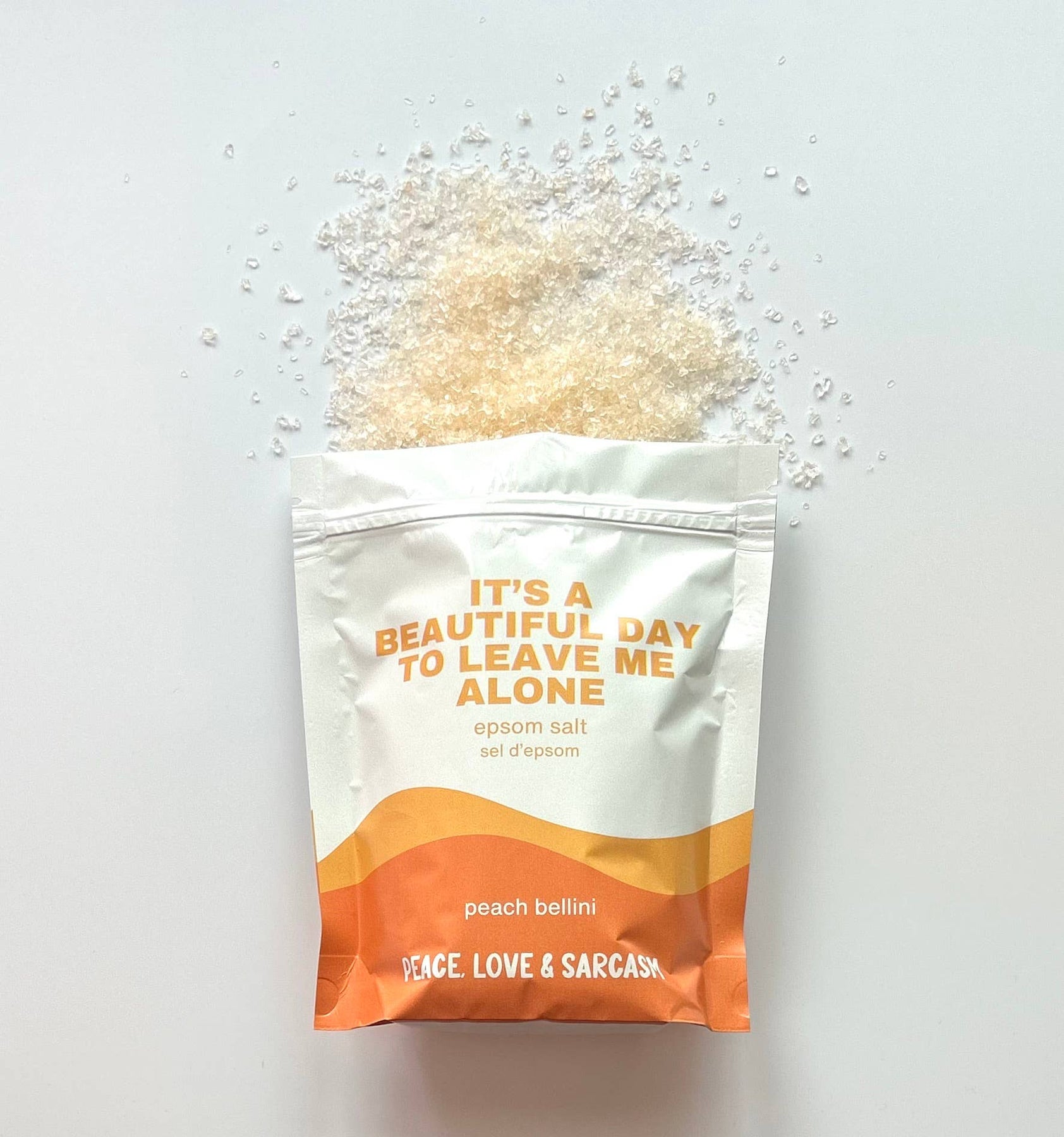 "Indulge in a relaxing bath with our peach bellini scented Epsom salts. Featuring a humorous label that reads "It's a Beautiful Day to Leave Me Alone," these salts are the perfect way to unwind and escape from the world. Treat yourself to some well-deserved alone time and let the soothing scent transport you to a peaceful state of mind."