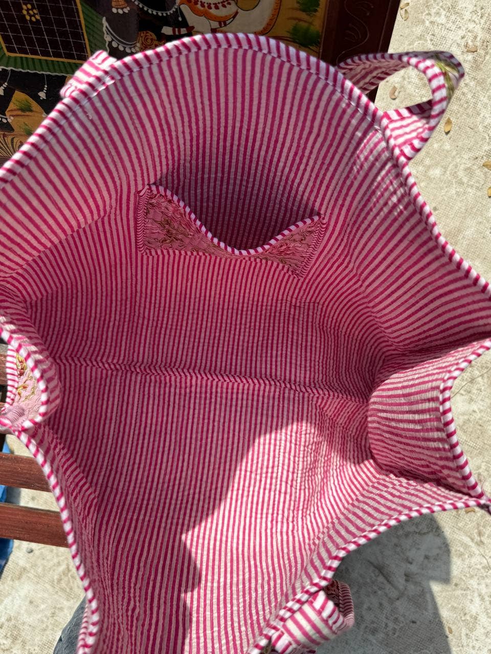 Designer Indian Printed Cotton Bags, Girls Bags, Tote Bags. The Indian Screen Printed Cotton Quilted Women's Handbags from Rajasthan India. This Handbag is completely Indian Printed on good quality cotton. Cotton quilted travel Bag made by Indian Artisans, This cotton quilted shopping bag is totally unique and multi purpose. Use this for your grocery or as a travel bag. Perfect to suit all. Item :- Cotton Handbag SIZE MEASURES:: Height: 18 INCH Width: 18 INCH Handle: 11 INCH Gusset: 5.5 INCH Pocket - Inside Material: Cotton Technique: Quilted Pattern: Floral Print Style: Tote Bag Color :- As Picture Shown Wash Care :- Dry Clean.