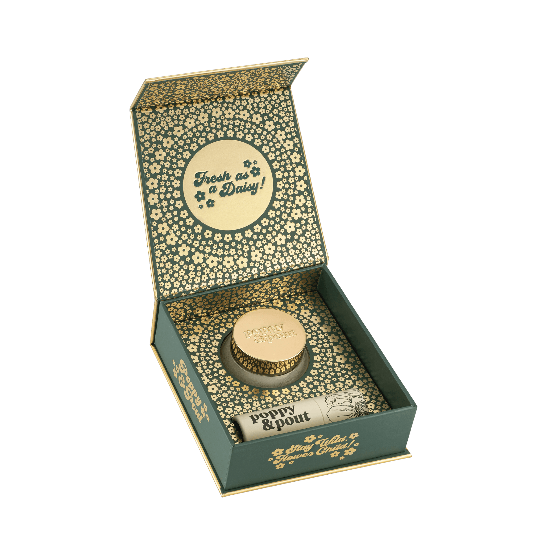 Step up your lip care routine with our Lip Care Duo! This gift set includes one matching lip balm and lip scrub in our signature (newly updated!) green and gold, recyclable gift box. These gift sets are sold in case packs of 5. Sustainable Gifting Your customers will love this already giftable item! We've condensed the packaging overall for a smaller, more sustainable footprint. This also optimizes that precious retail space you always seem to need more of! (Or less expensive shipping costs, if you're an online store!) Retail Ready Our new lip care duo packaging is retail ready with an outer sleeve and hang tag as well as images and descriptions as to what's inside. Customers can easily see exactly what their buying, and the incredible value it has!